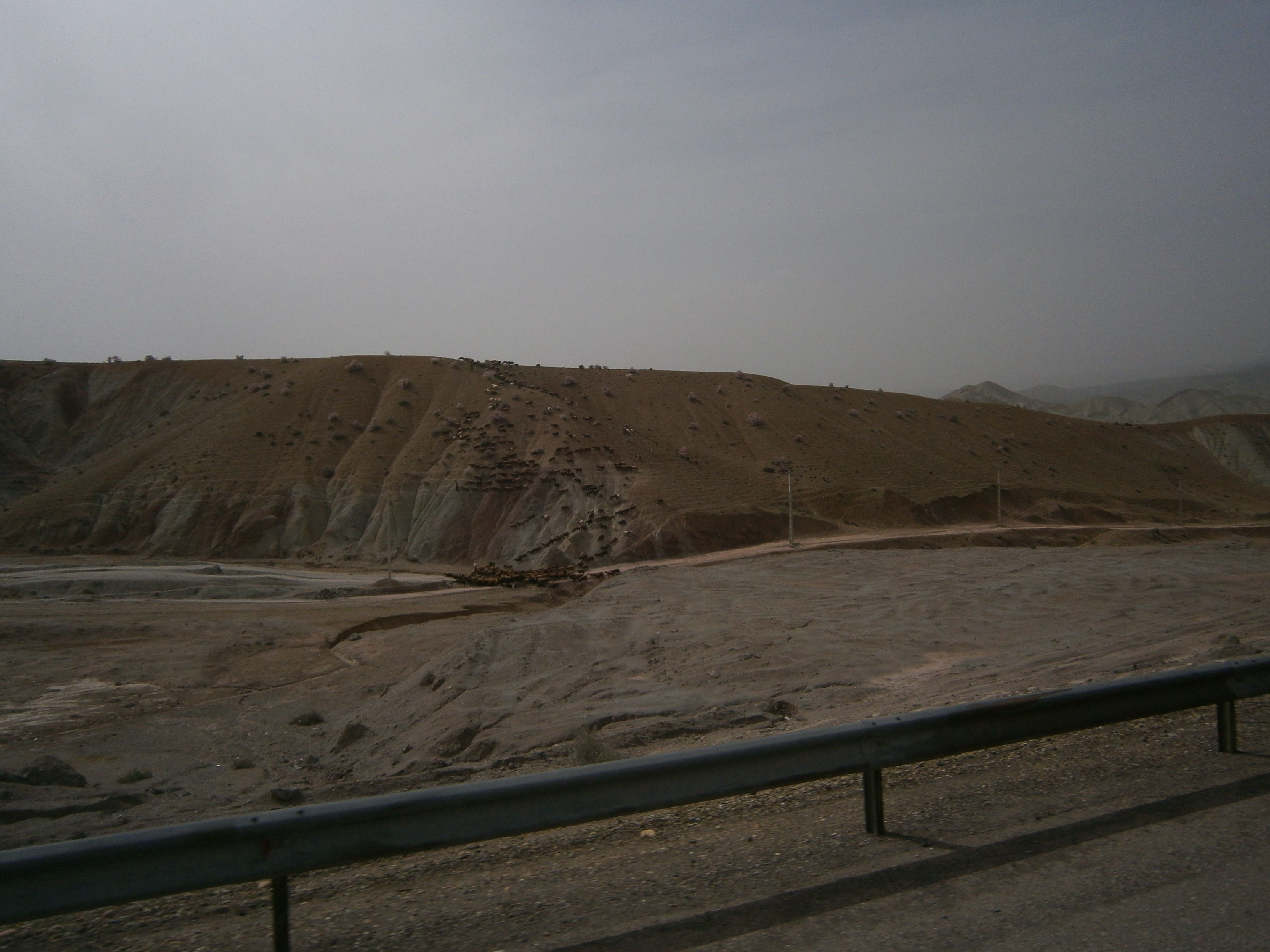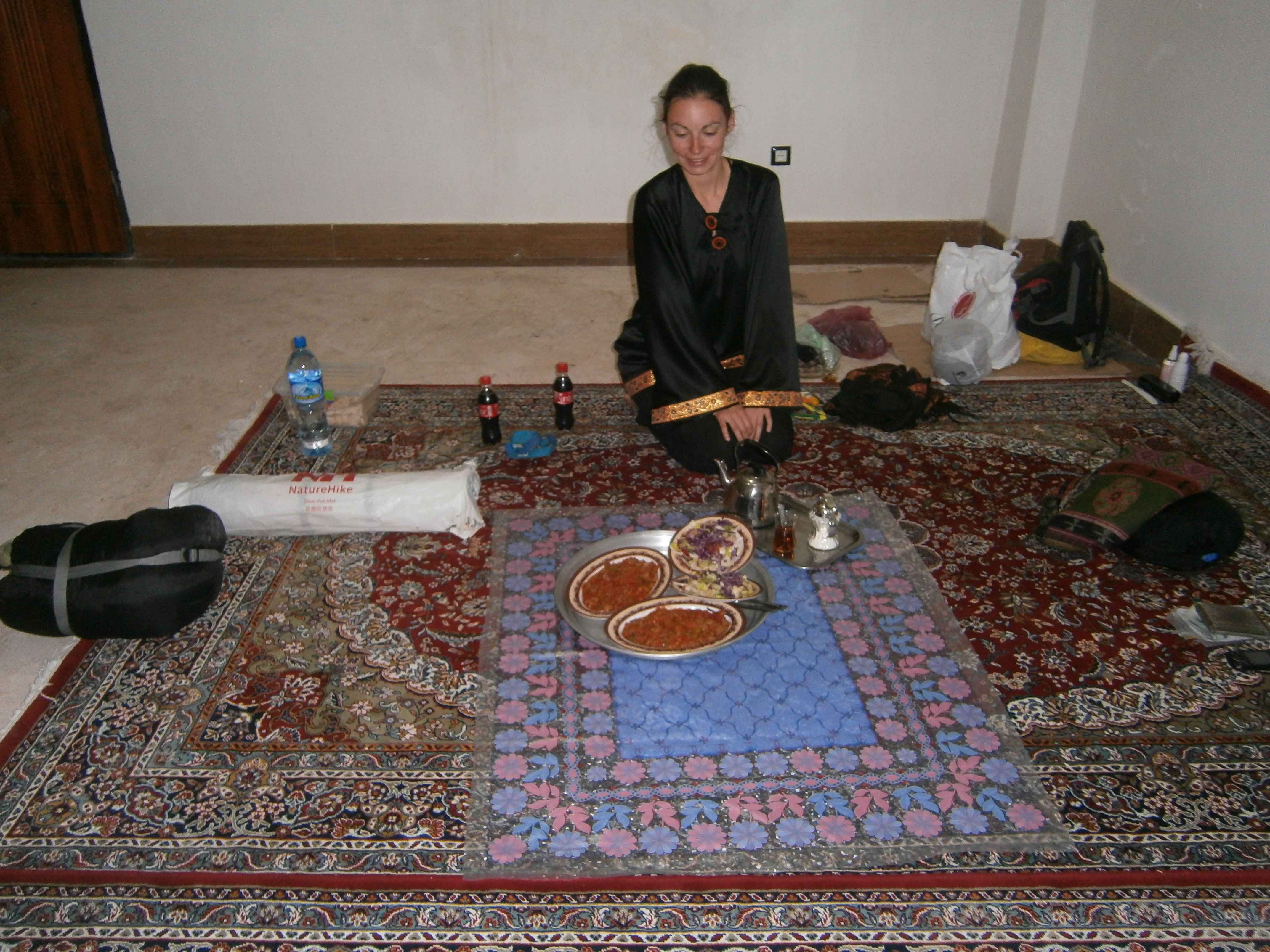 The driver was Turk and his name was Abdullah – since he is from Turkey which is neighbor country to our own – Bulgaria, we had a nice talk. Probably we smelled a little bit because he poured ginormous quantities of lemon eu-de toilette on us. The truck is driving very slowly so we can enjoy the landscapes that surround us – and they are amazing: strange sand forms on the hills and no trees. In the evening we reach a truck parking near Evoli which is 100 km. from Tabriz. We just pitched our tent and Abdullah, the truck driver came by and said he talked to the boss of the parking to find a room for us. They gave us one big apartment with no furniture but with very nice Persian carpets on the floor. He also gave us key to lock ourselves from inside – oh, what caretakers are always the Turks and Iranians.