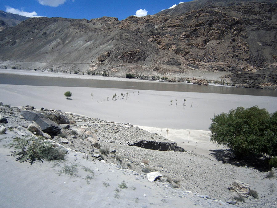 In the beginning the road continues along Indus River, it is very beautiful, there is a lot of sand everywhere and the scenery looks a little bit like desert, though the villages we pass by are quite green and everywhere there is a sweet smell coming from a tree we see everywhere. Later we divert and continue along Shyok River.