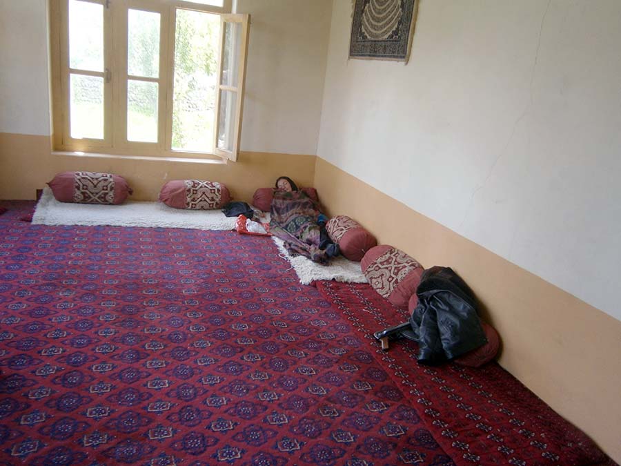 The only transportation to the village is an old Land Cruiser that leaves once a day at 12 p.m. There are almost no private cars passing by – maybe 1-2 a day. We put our luggage in the jeep and we are ready to go. But it results that the policeman that follows us everywhere has to go with us and we are supposed to pay for his ticket. We refuse to do it. Then an hour later he is given traveling expanses and we are off.