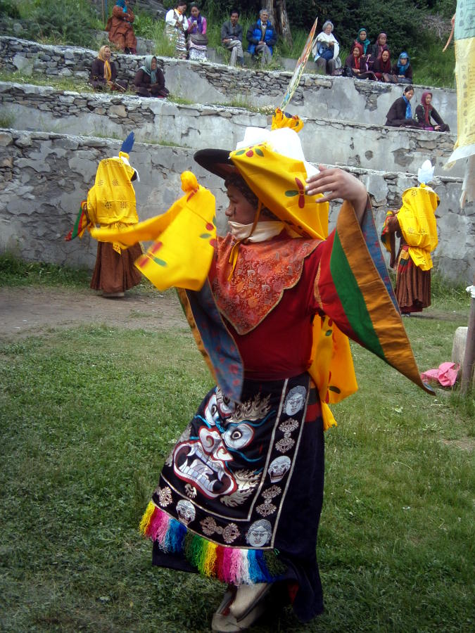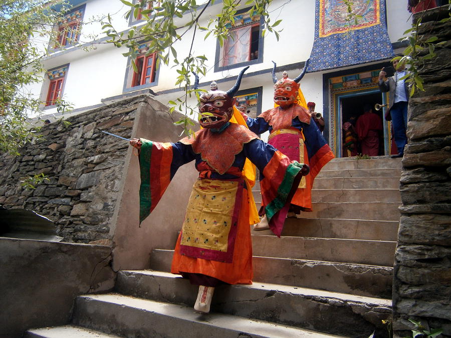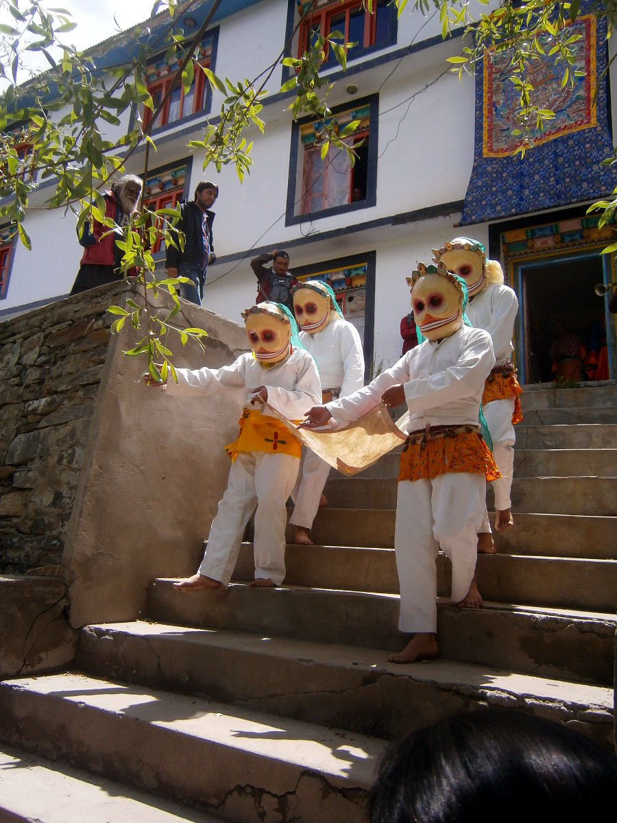 In the morning the monks read sutras and blow horns and the people in the village prepare food. The ritual dances start in the afternoon. The monks are dressed as daemons, wear giant masks and dance around an altar. At a certain point four of them dressed as skeletons bring a small casket and start performing rituals around it. They stab knives in it, pour water, fix sticks and perform other strange ceremonies.