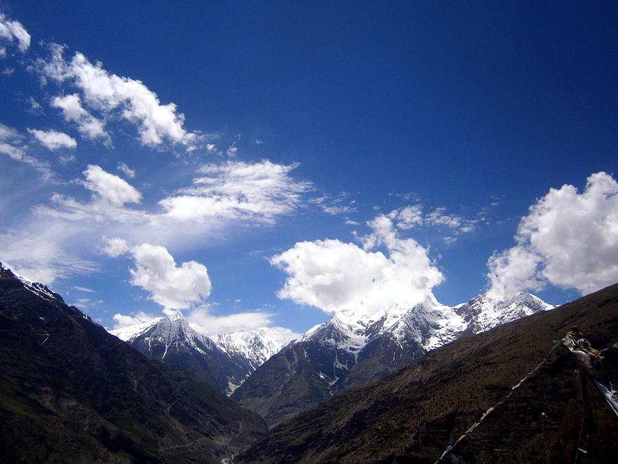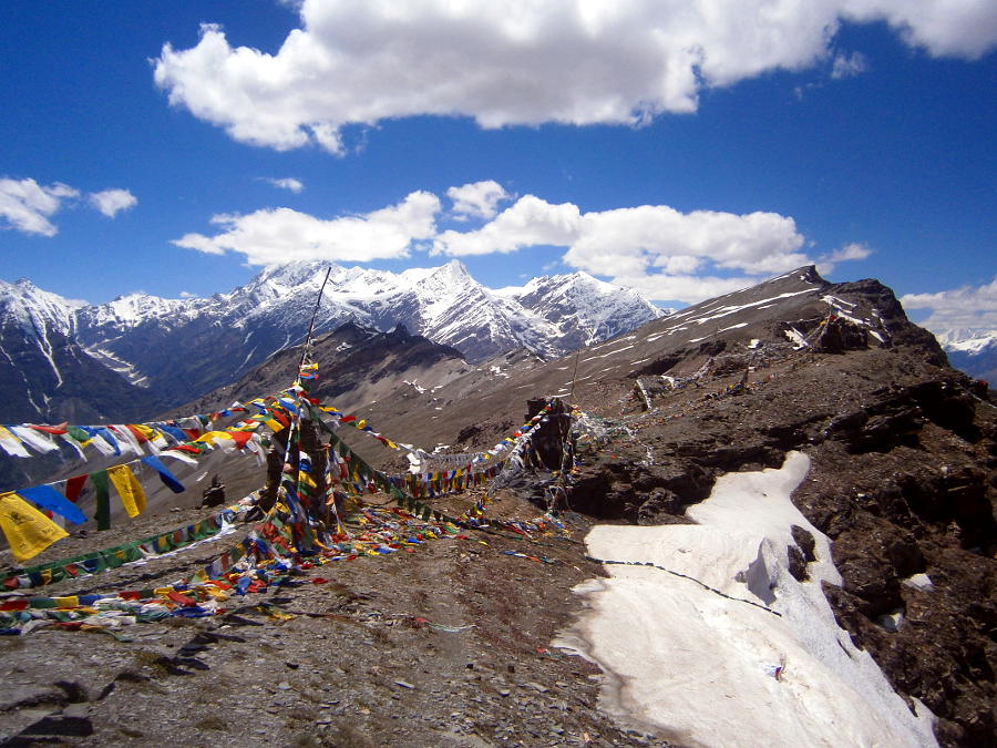 Finally we reach the peak and we see this: hundreds of stupas made of stones and covered with Buddhist flags. All around one can see the mighty Himalayan peaks covered with snow.
