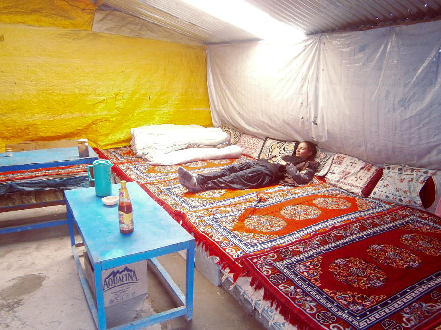 The driver and his wife rush to the hospital to breathe oxygen with masks and we go to look for a place to pitch our tent breathing heavily and staggering. In the day the sun burns your skin in an instant but during the night the temperatures fall below zero (below 32 Fahrenheit). We are freezing and even the slightest gust of wind makes us shiver. We barely manage to wash our faces with cold water and start preparing our dinner – noodles cooked on our brand new kerosene stove of which we cut some parts to be lighter and put new hose for the fuel.