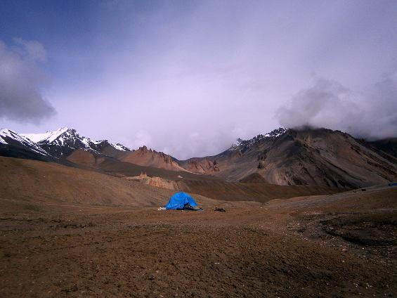 We are replenished after the long rest and we reach the foot of the first pass – Sisir La (4700 m. or 15 420 feet). We head up and start looking for a flat place to pitch the tent but we almost reach the top, it is getting dark and we still don’t see anything acceptable. Finally we climb a hill and reach a place that looks level enough. The only problem is that the soil is very strange – it is swampy, soaked with water and very soft.