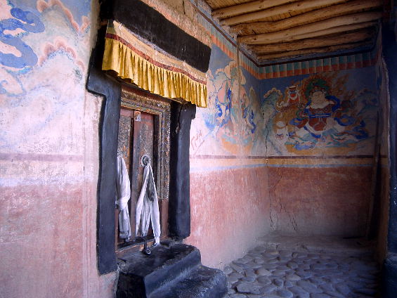 The temple is very small and dark and most of the writings on the walls are destroyed, It is older than the monastery – dates back to 11-th century. In a side room we see statue of the protectors who look quite ominous – in fact more like daemons than protectors, and in addition there is a skeleton painting on the wall.