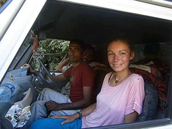 Another truck with apples stops then, but people in it are nice and it moves faster. The second driver goes on the outer side of the driver which is a crazy way to drive even for India. After several hours of bumping on the road we manage to pass the record for India 150 km. The road we drive on is so wild and unpopular that we can’t believe our luck. The region is very beautiful. There are banana trees and other exotic plants. It gets very humid.