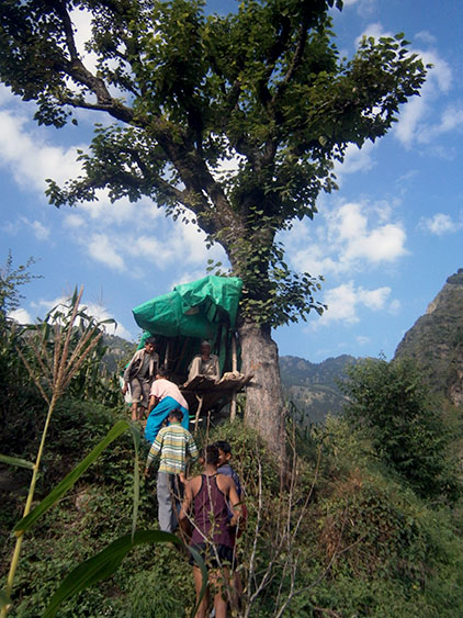The village has specific old architecture and joyous local citizens. We like the place very much. Around 9 a.m. pupils go to school, but the boy who gave us the cucumbers stays – and for a good reason, today is his turn to guard the corn fields from the monkeys together with his granddad. They have wooden shelter from where they can see the whole slope with their binoculars. The granddad is at guard from the morning and from time to time shouts and produces some strange guttural sounds.