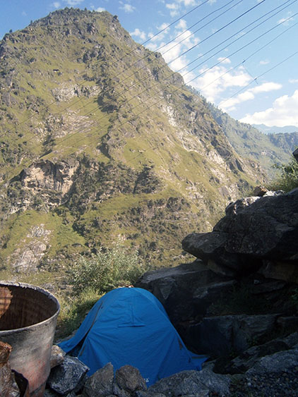 In the evening we decide to go to Ponta Sahib which is a small town 50 km. away. The main reason is it is located in the plains. Here it is hard to find a flat enough place to pitch our tent and in addition the vegetation is thick. We settle next to a river near a village hidden in the jungle above us.