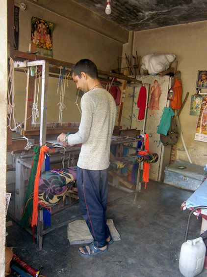 There is a guy who peeks in our tent. Pupils start coming to school. We want to sleep more, but we have to get up obviously. Our tent is right next to some stairs that lead to another house where there is a kindergarten and the workshop of a weaver, where he also lives. The person who peeked into our tent is this same guy. He is a very nice person. He invites us to use his bathroom and his gas stove. We drink tea together and he shows us the Kinnuar blankets that he weaves. Pupils at the school and the kindergarten are no more than 10 in total and soon we become friends to all of them. They are all from Nepal (there is a huge wave of refugees coming from there to India).