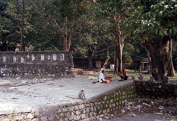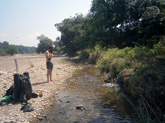 We plan to continue on a road we saw in Google maps that goes to Haridwar and passes on the not so populated bank of Ganga River. It passes through the east part of Rajaji National Park. We start walking in the forest above Rishikesh and after a while a car stops and takes us for 10 km. The car continues to the lower parts of Rishikesh and leaves us at the barrier of the national park. In the beginning the guards don’t want to let us enter because we are on foot, but we manage to convince them that we will hitchhike right after the barrier. A car passes by shortly after and takes us 20 km. inside the park. We get off, pass by some shabby hotels and decide to stay here because there are only 5-6 km. to Haridwar where the national park ends.