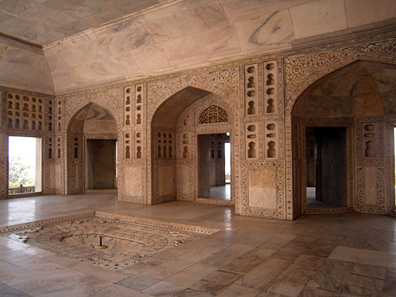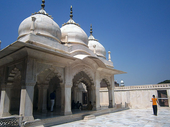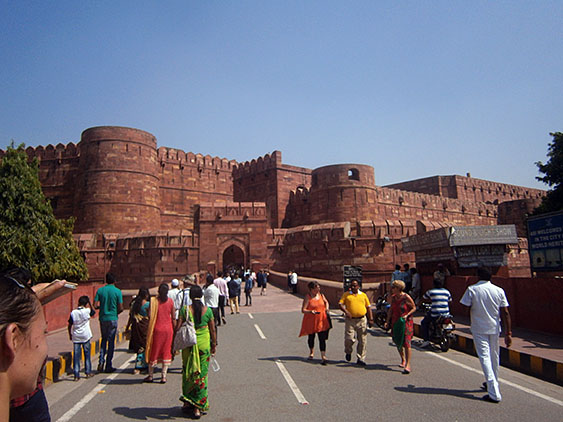 The next landmark we go to see is the red fort of Agra, which is close to Taj Mahal. Here the Moghul rulers had lived. The architecture is stunning. One can see the tomb on the banks of Yamuna River from the balcony where the emperor sat everyday gazing at it.