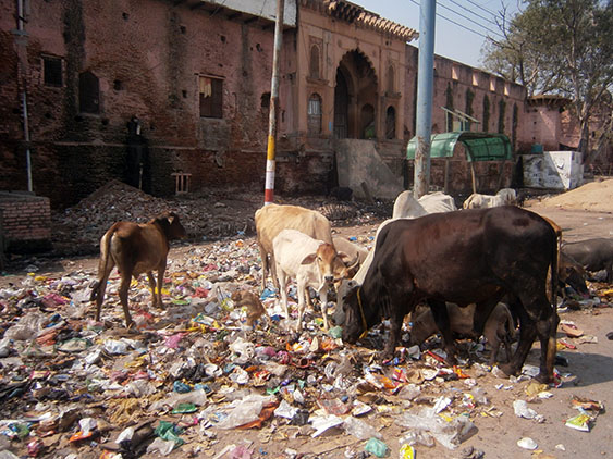 We catch a rickshaw to Mathura which is 2-3 km. away. The town doesn’t impress us much nor the temple where Krishna was born. The building is newly built and the main room resembles prison because the legend tells that Krishna’s parents were chained when he was born. There are many visitors and the security is strict. One must leave all electronic devices at the entrance. Then we walk on the ghats of Yamuna River and around the local market. The river banks are terrible – monkeys, rats, tons of garbage, excrements and all this with the background of buildings with strange old architecture. All looks really shabby. People at the most holy ghat enter the river surrounded by garbage. Understandably there are no tourists here.