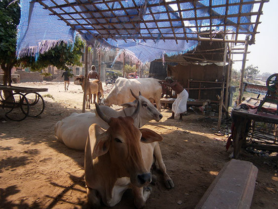 While we are hanging around Keshi ghat searching for a hotel, restaurant or a luxury shop where we can leave our rucksacks we witness how a cow is being cleaned. A guy with a towel cleans every centimeter of the cow including her ears and ass. The cow seems to enjoy this very much and is pushing her head in the person just like a kitten. Then she lied down and fell asleep.