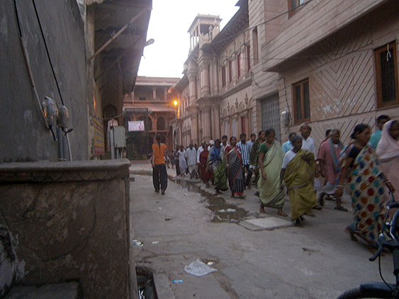 It is indescribable to walk in a town where every single building has some religious purpose. Strange dark catacombs and rooms filled with unknown to us deities; old temples with thousands of pilgrims inside; modern white temples with seemingly limitless financial resources; cows, dogs, rats, pigs, monkeys digging in the garbage piles. Pilgrims, who are usually in groups of several hundred and have a guide with them, clog the streets. Almost everyone is barefooted.