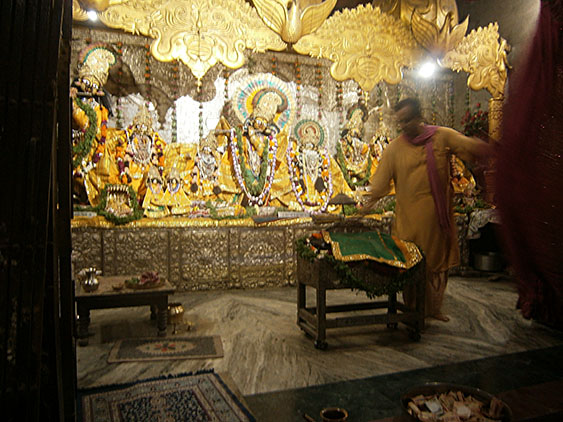 We start running like crazy around different temples and everywhere we have perform a different ritual – going around the temple exactly four times, bowing in front of the Murti, drinking holy water etc. The last temple we visit is called Radha Raman and while we are making the bows somebody gives us binoculars to look at the Murti.