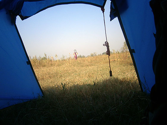 At this moment I start shouting at them that all Indians are terrible people with rotten hearts and that Krishna is watching them – something I don’t think at all. The oldest one is embarrassed by my words and tells the other ones to leave. He keeps saying we can stay and sleep here. When they leave we are off immediately too. Obviously this place is unsafe. We walk for 15 minutes and reach a small village. Like this if something happens we can ask for people’s help. We pitch our tent behind a bush in the field hoping there will be no problems till the next morning.