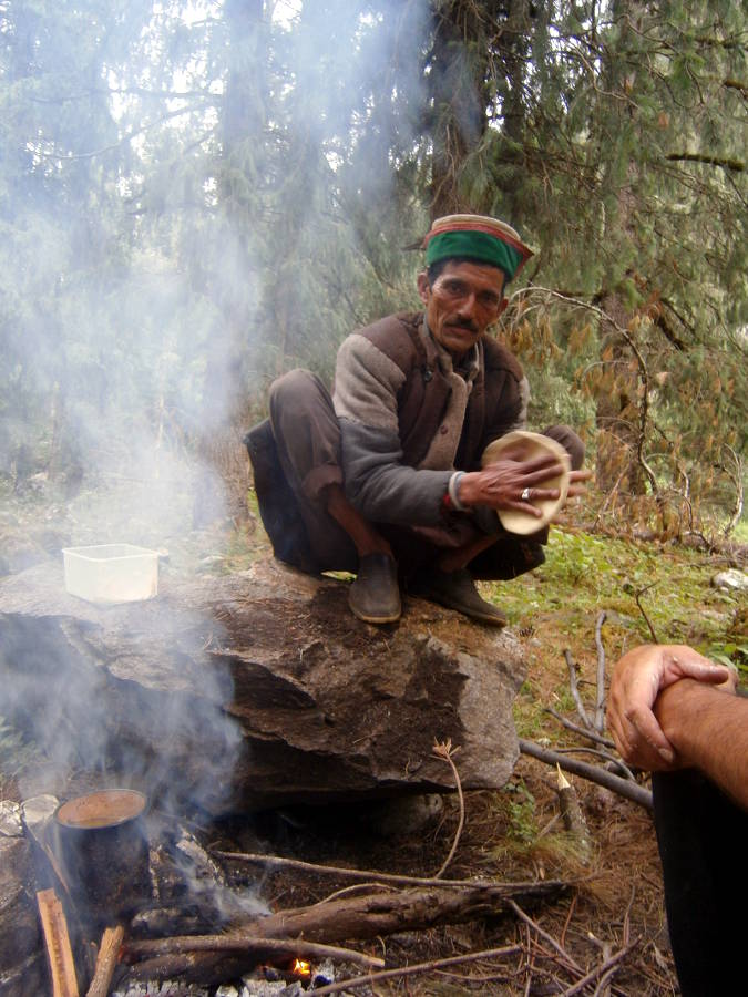 The chapatas: it is best to bake them on live coal wood fire (if there are cow excrements even better). Tear some dough and make a ball of 5-6 cm. in diameter (2 inches), make it spherical and then start rolling it with your fingers and making it flat at the same time – make it as thin as you can without tearing holes in it. Then you have to start slapping it on your palms in order to make it evenly thick everywhere. Baking it is fast and easy and you have to be careful to not touch the coal with the chapata because it extinguishes it. Turn them every few seconds in order not to burn them. When the chapata is ready you can put it in cloth or a newspaper. If you don’t have fire you can bake/fry them with some cooking oil on the stove.